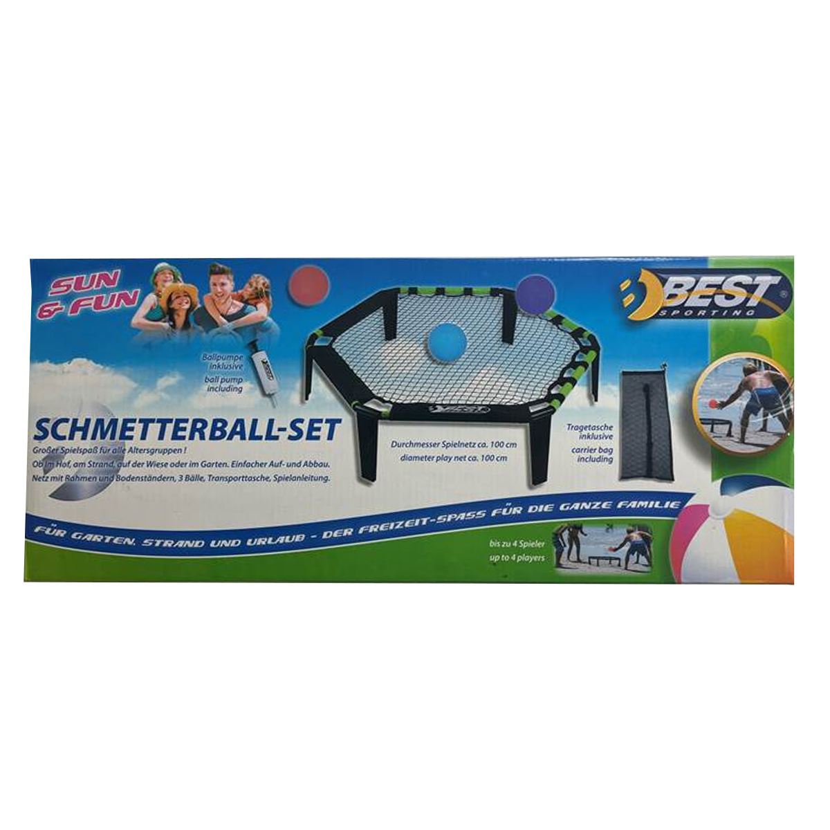 Schmetterball-Set. Grosser Spielspass für alle Altersgruppen. Ob im Hof, am Strand, auf der Wiese oder im Garten. Einfacher Auf- und Abbau. Netz mit Rahmen und Bodenständern, 3 Bälle, Transporttasche, Spielanleitung.
