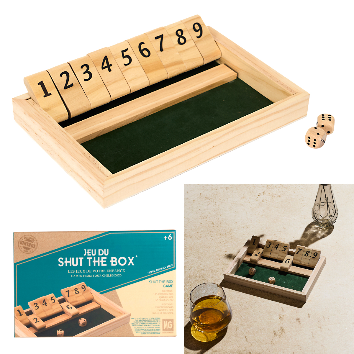 Das Spiel Shut the Box ist ein klassisches Holzspiel, das Zufall und Strategie vereint. Ausgestattet mit 9 Klappen, nummeriert von 1 bis 9, und 2 Würfeln, besteht das Spiel darin, die Würfel zu werfen und die Zahlen entsprechend der erzielten Summe herunterzuklappen. Ziel ist es, alle Klappen zu schließen oder am Ende die niedrigste Punktzahl entsprechend den verbleibenden Zahlen zu erreichen. Unterhaltsam und gesellig, ist dieses traditionelle Spiel sowohl für Kinder ab 6 Jahren als auch für Erwachsene geeignet, ideal für eine kurze Partie mit der Familie oder Freunden.