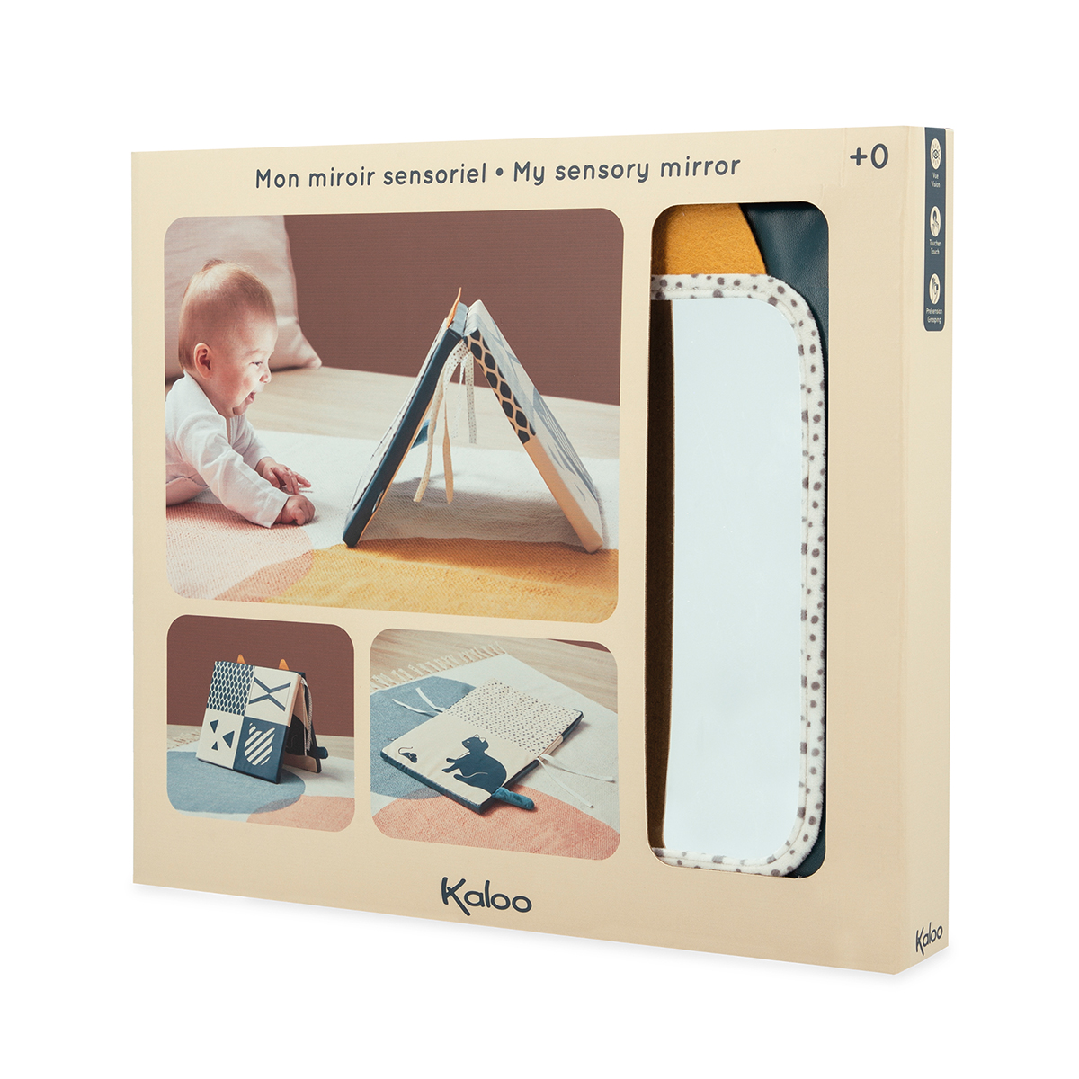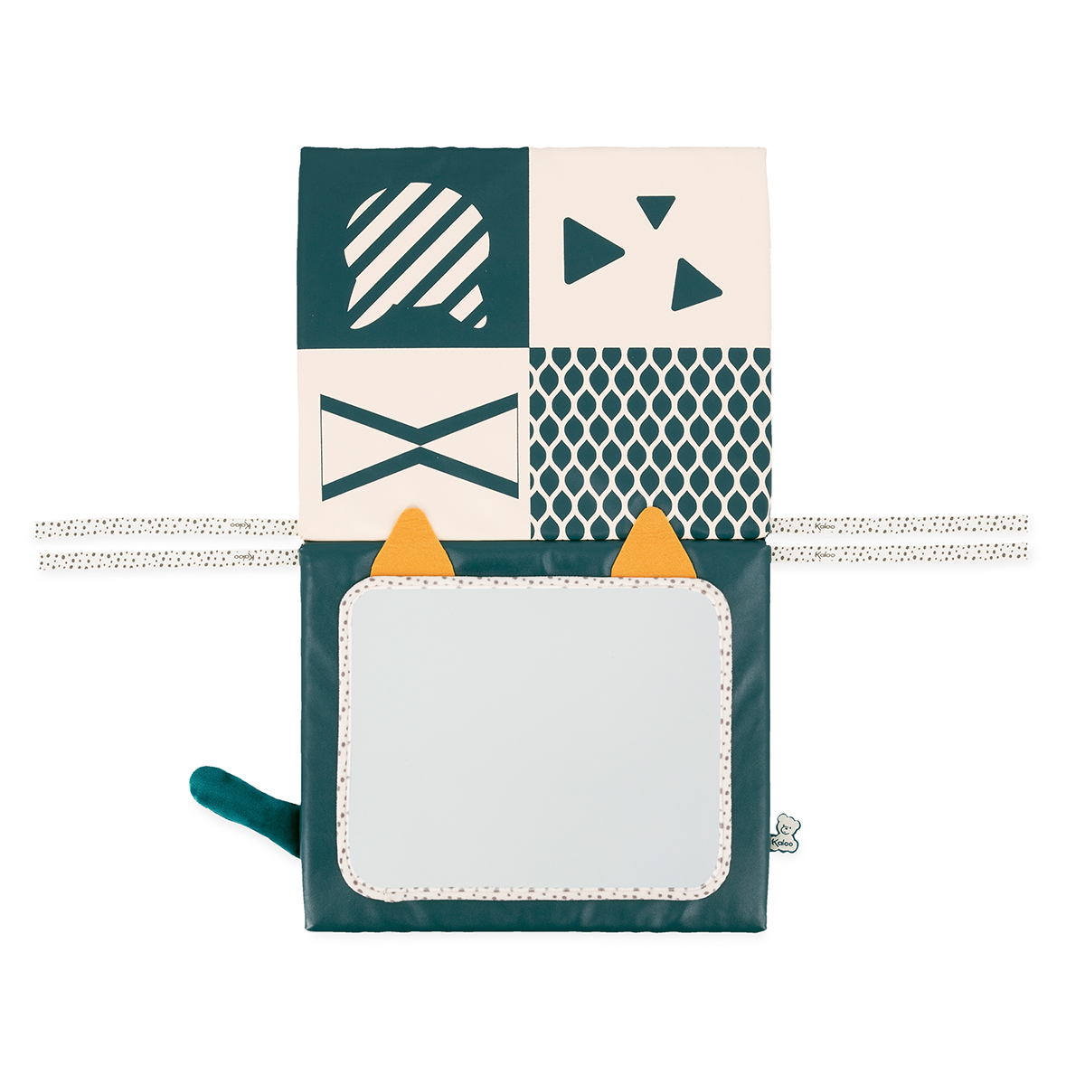 Sensorischer Spiegel mit 4 Seiten, Format: 24,5*29 cm, leicht zu transportieren, langes Band zum Aufhängen am Laufstall, ermöglicht es dem Baby, sich selbst und sein Spiegelbild zu entdecken. Viele grafische Elemente zur Stimulation, visuelle Stimulation durch sein Spiegelbild, abwaschbares Material, entwicklungsfähig, sensorisch.