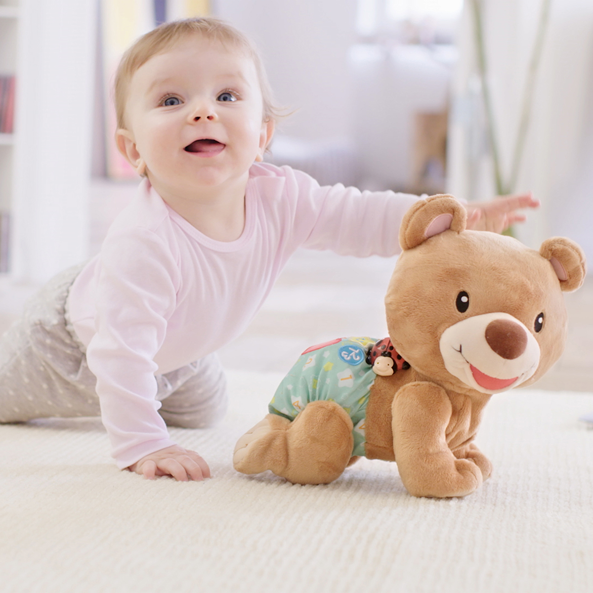 Los krabbel mit mir! Der niedliche Plüschbär animiert zum Hinterherkrabbeln und fördert spielerisch die Motorik. 2 Modi: Krabbeln & Zählen oder Sprechen & Singen. Lerne Formen, Farben und Lieder kennen. Bärchen krabbelt von alleine. 3 interaktive Tasten und eine grosse Herz-Taste. Aufleuchtender Marienkäfer. 5 gesungene Lieder und 10 Kindermelodien. Mit Abschaltautomatik.