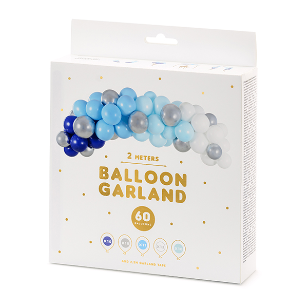 Guirlande de ballons en bleu de 2 mètres de long. L'ensemble comprend 10 ballons en argent, 10 en bleu marine, 10 en bleu clair, 10 en bleu pastel, 10 en bleu ciel pastel et 10 en blanc pastel. Aussi un ruban 2.5 pour les ballons.