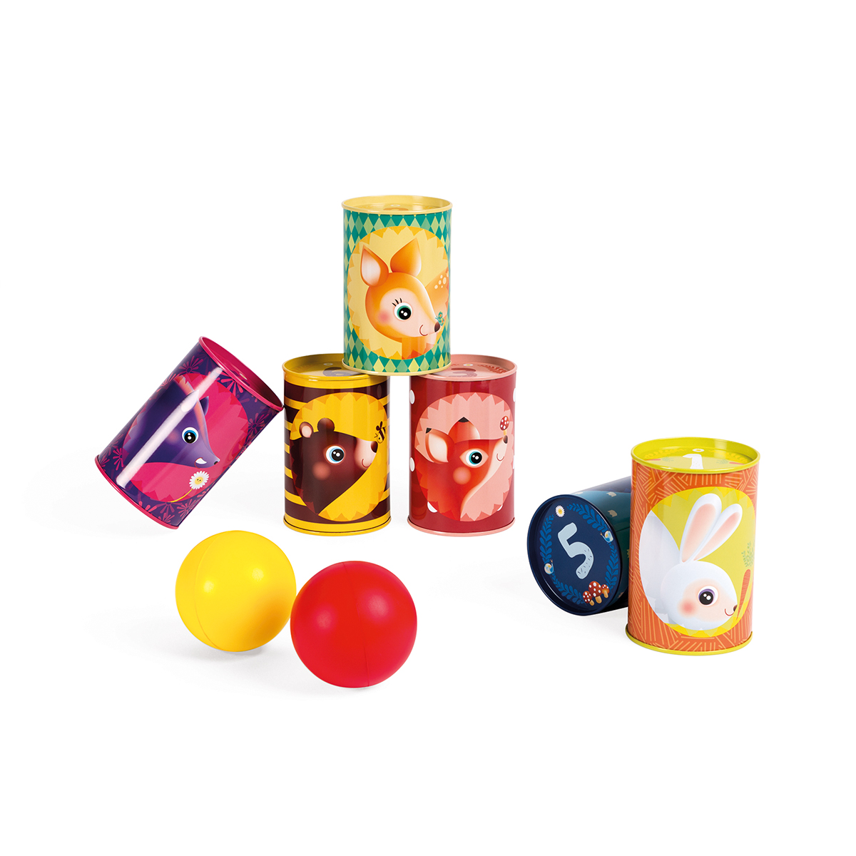 Amuse toi à dégommer toutes les boites en un minimum de lancers! Un jeu de chamboule-tout illustré sur le thème des animaux de la forêt, composé de 6 boites en métal et de 2 balles en mousse, indispensable pour organiser une fête à la maison ou pour jouer en famille en plein air! Dims boites: 6,5 x 6,5 x 10 cm. Dims balles: 6 x 6 cm.