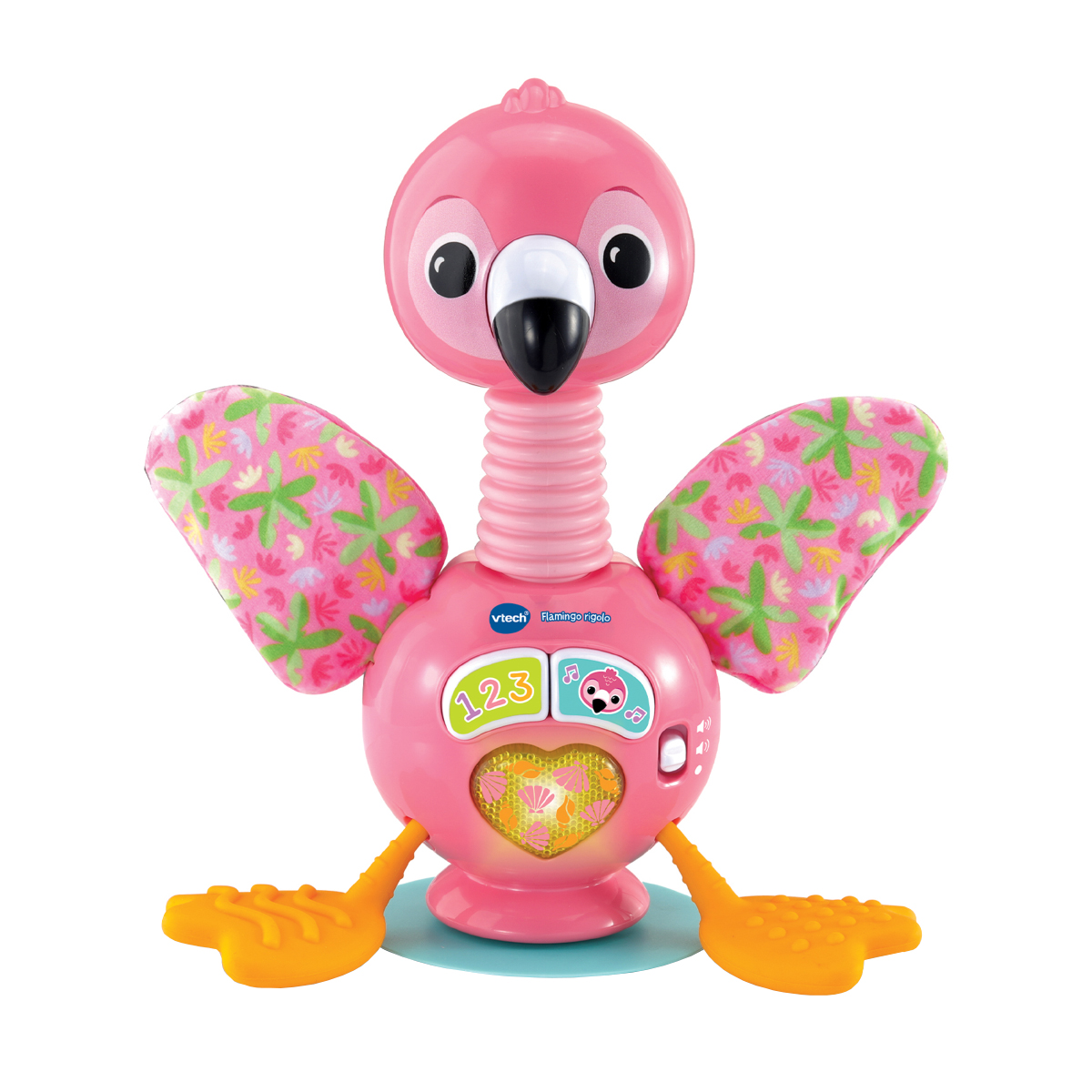 Temps pour un amusement animalier et rigolo à bascule! Flamant rose joyeux qui s'illumine, chante et se balance de manière amusante. En tirant sur les pattes en silicone souple, le flamant bat des ailes et joue des phrases appropriées, de courtes mélodies et des sons. 2 touches colorées: en appuyant sur les touches numériques, l'enfant apprend de manière ludique les chiffres de 1 à 3 et entend des faits correspondants sur le flamant ainsi que des sons; en appuyant sur la touche flamant, des chansons et des mélodies sont déclenchées. Le cœur sur le ventre du flamant s’illumine en fonction des phrases, des chansons et des sons. Différentes textures sur les pattes ainsi que les mouvements des ailes et des pattes favorisent la motricité fine et la perception sensorielle. Contenus d’apprentissage: chiffres, musique, motricité fine, faits sur le flamant. Les ailes sont en tissu crépitant doux, les pattes et le cou en silicone flexible. Grâce à la ventouse, le flamant peut être fixé sur des chaises hautes, des tables, etc. 3 chansons chantées et 10 mélodies. Compartiment à piles sécurisé pour enfants, arrêt automatique et réglage du volume.