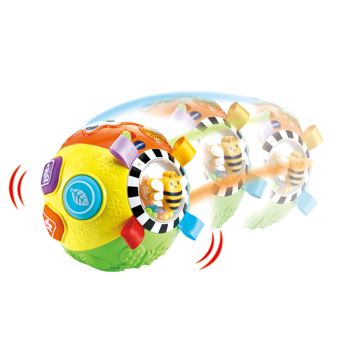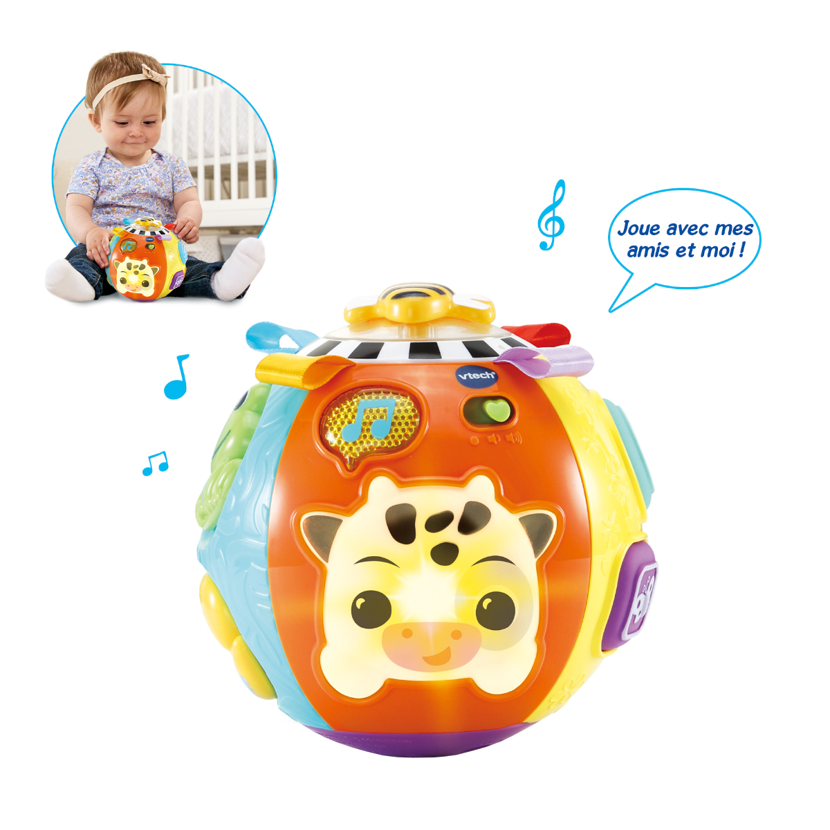 Plaisir coloré de rouler! Balle de jeu colorée avec 5 surfaces de jeu différentes, qui encourage à ramper après elle. 3 modes de jeu: Bouton vache (phrases, mélodies, chansons et sons sont joués), capteur de mouvement (déclenche des sons lorsque la balle roule) et boutons de forme (déclenchent des réponses, des mélodies et des sons). Éléments en tissu coloré (rubans sur le dessus) développent le sens du toucher. Lorsque la balle bouge, les perles colorées sur le dessus de la balle font du bruit. Contenus éducatifs: musique & sons, formes, perception tactile, développement des compétences motrices et encouragement. 3 grands boutons souples en plastique de différentes formes. Bouton vache: la vache s'illumine de différentes couleurs en fonction des contenus joués. Le canard et la grenouille peuvent être déplacés. Abeille rotative sur le dessus de la balle. 3 chansons chantées et 15 mélodies. Compartiment à piles sécurisé pour enfants, arrêt automatique et réglage du volume.