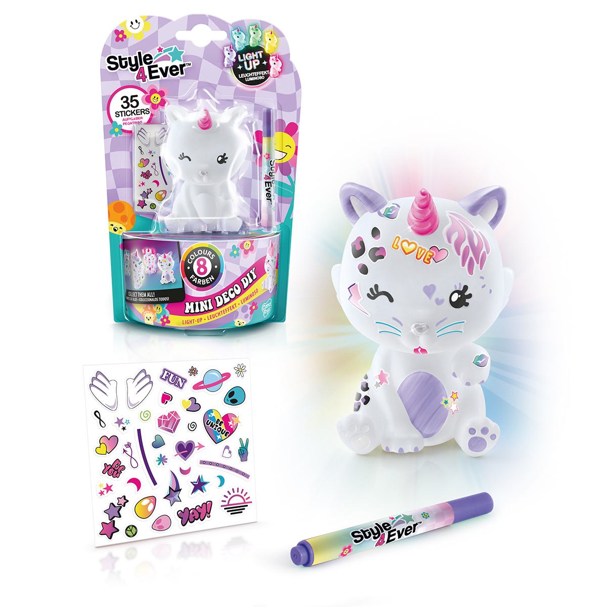 Décore ton caractère avec des autocollants et le marqueur ! Allume-le, il émet une douce lumière multicolore. 2 nouveaux personnages à collectionner ! Inclus: 1 Personnage lumineux à décorer, 2 feuilles d'autocollants pailletés, 1 feutre