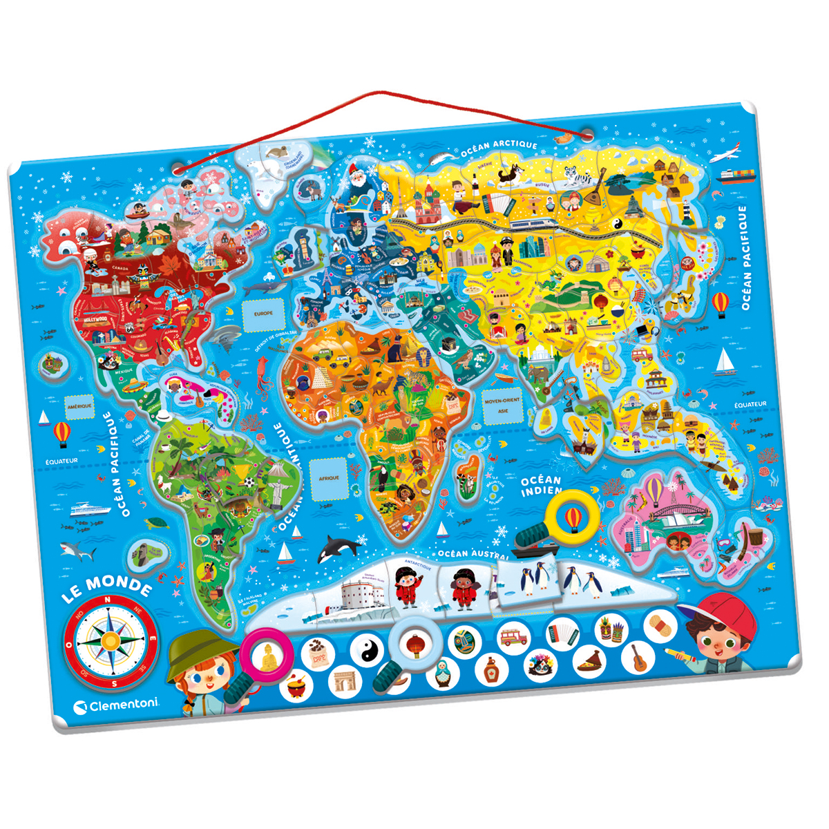 Un puzzle magnétique coloré pour recomposer le planisphère du monde avec un jeu d’observation pour découvrir les particularités de chaque continent. Le puzzle, de dimensions 55 x 42 cm, est constitué d’un carton résistant, adapté pour jouer avec les aimants. Grâce au cordon pratique, le puzzle peut être accroché. Une multitude d’illustrations originales pour apprendre en s’amusant. 110 pièces magnétiques.