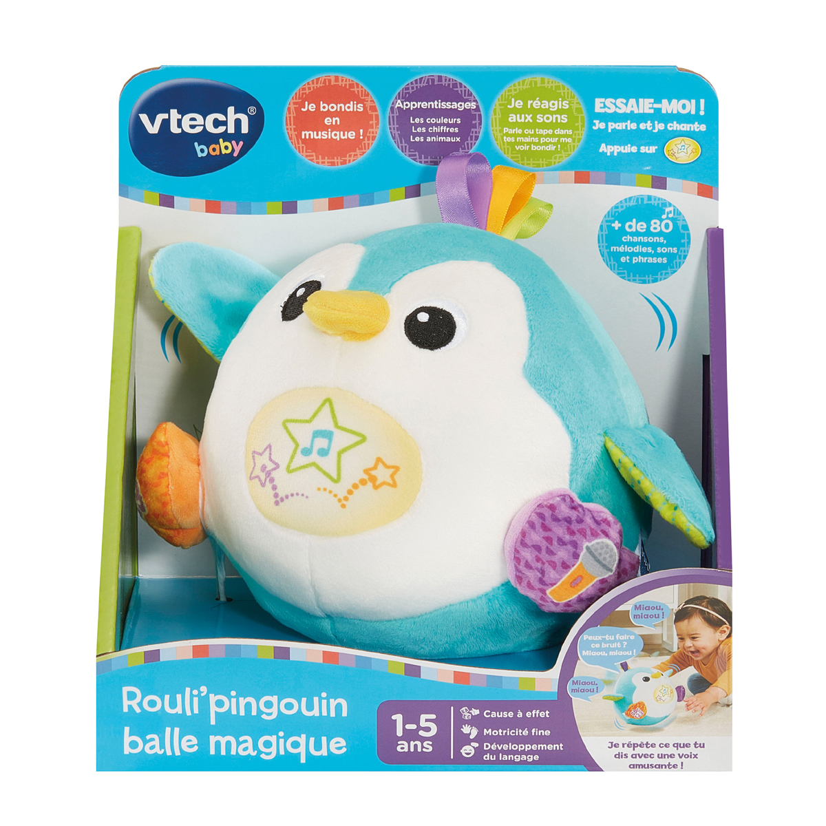 Sauter et chanter, c’est ainsi que le plaisir peut commencer! Pingouin coloré en peluche douce, qui saute, parle et encourage à participer. Le pingouin est activé par des sons et peut répéter ce qui est dit avec des effets amusants. 3 boutons interactifs: bouton étoile sur le ventre (invite l’enfant à participer, par exemple en applaudissant) et joue des mélodies, bouton lettres et chiffres sur les pieds (l’enfant apprend de manière ludique les premières lettres et les chiffres de 1 à 3) et bouton microphone (invite l’enfant à imiter des sons amusants, qui sont ensuite reproduits avec des effets vocaux parfois comiques). Rubans satinés colorés sur le dessus et ailes douces en tissu froissé développent le sens du toucher. Contenus d’apprentissage: lettres, chiffres et animaux. 4 chansons chantées et 11 mélodies. Compartiment à piles sécurisé pour enfants et arrêt automatique.