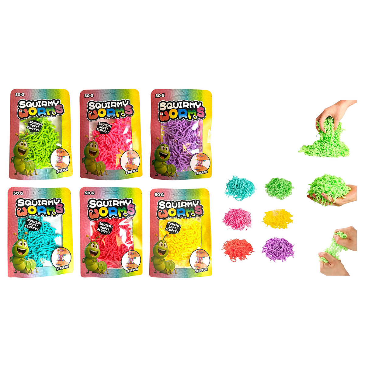 Squirmy worms 50g, 6-fois assortis en sac. Stretch, soft, fluffy et squish.
