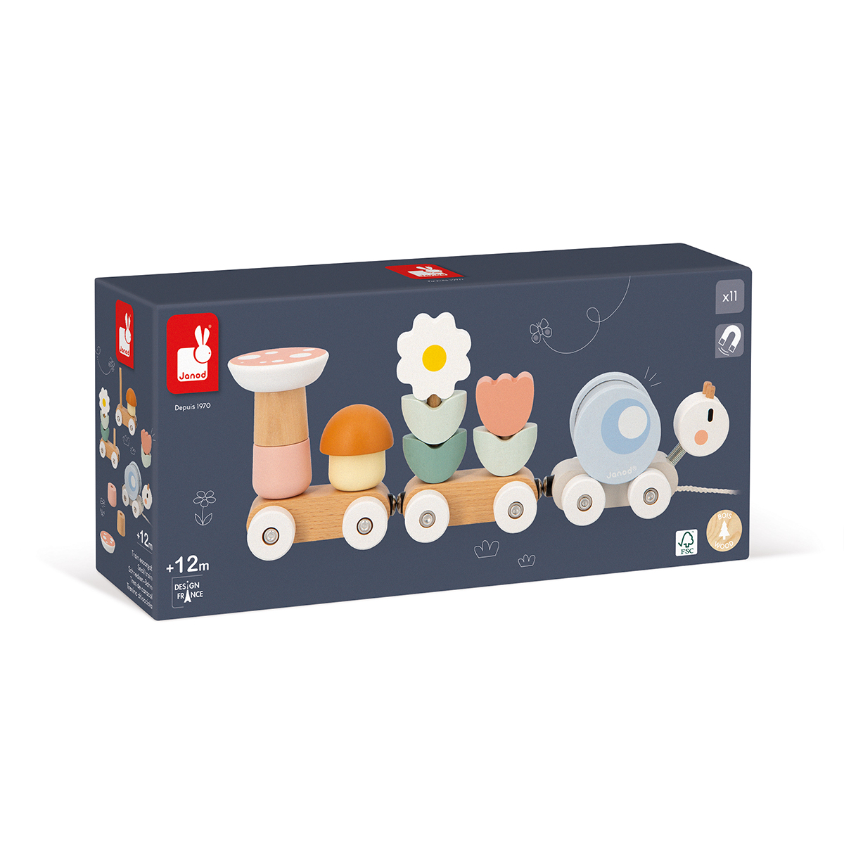 En route pour une promenade bucolique, à la découverte des fleurs et des champignons. Joli train escargot composé de 3 wagons avec 2 fleurs et 2 champignons à recomposer (10 pièces). La coquille de l’escargot est amovible : elle roule sur elle-même quand le train avance et se transforme en hochet à billes. Jouet idéal pour développer la motricité fine des plus petits et accompagner les plus grands dans l’apprentissage de la marche en allant se promener avec le train, grâce à la ficelle. Jouet d’éveil en bois. Jouet à tirer pour les enfants à partir de 12 mois.